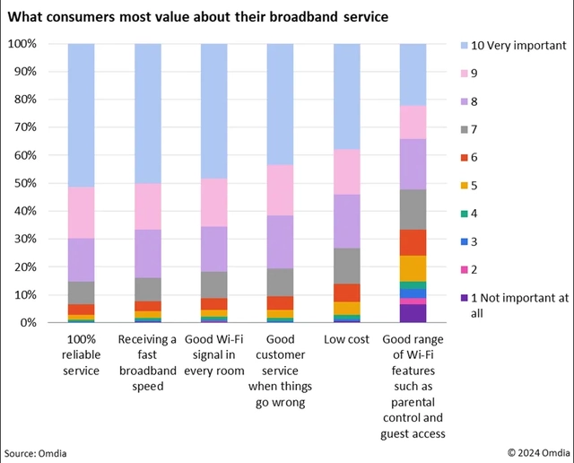 One goal of this strategy is to support the latest Wi-Fi standards. As of Q1 2024, 85% of operators tracked by Omdia are supporting the latest Wi-Fi 6 or 6E standards in their top gateway options, and 8% of operators are already offering Wi-Fi 7, even though Wi-Fi 7 has just been officially standardized on January 8, 2024.
