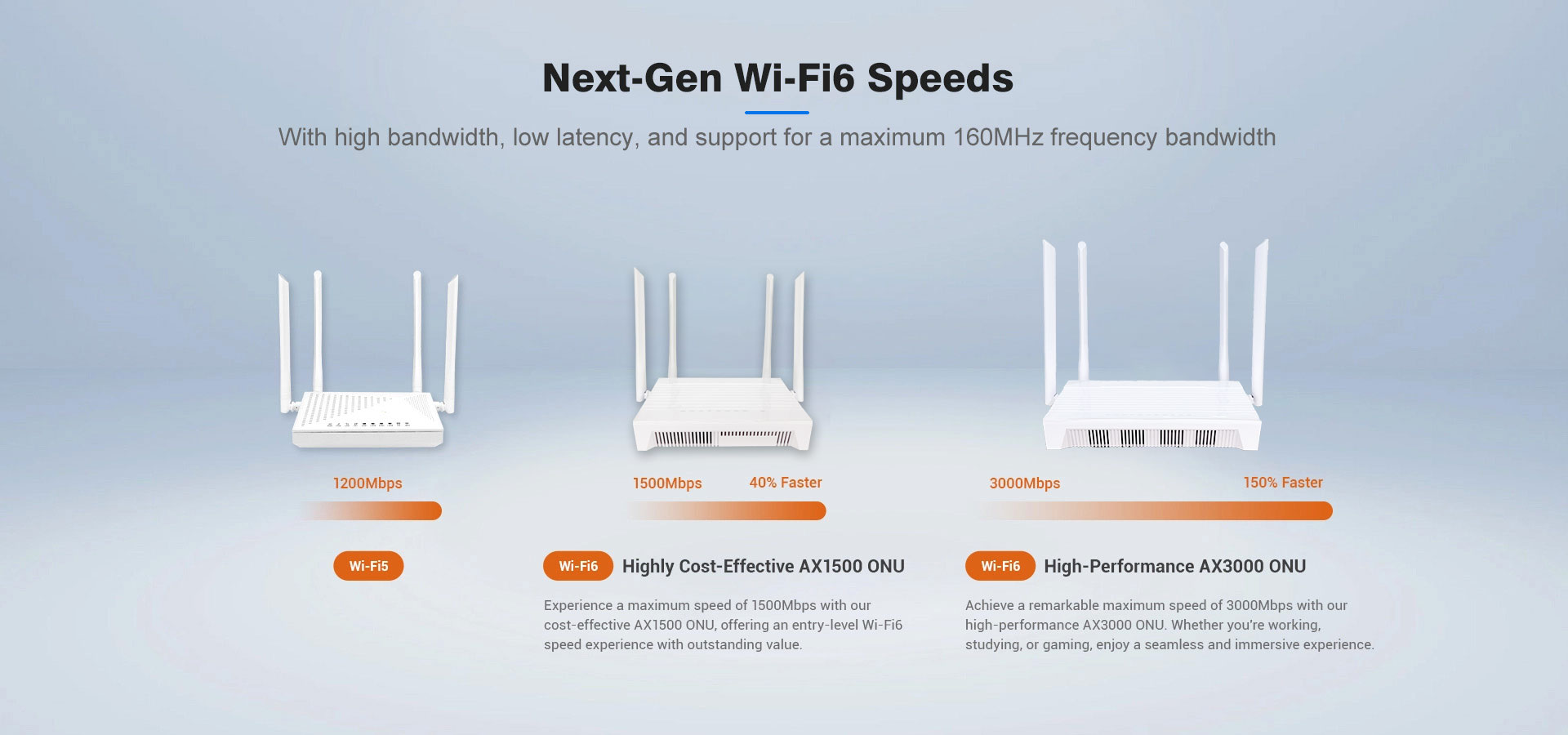 In ONUs, the differences between these Wi-Fi standards are mainly reflected in the network speed, connection density, stability and overall performance they can provide. With the continuous advancement of technology, Wi-Fi 6 ONU will gradually become the mainstream of the market, providing users with a faster, more stable, and more efficient network connection experience.