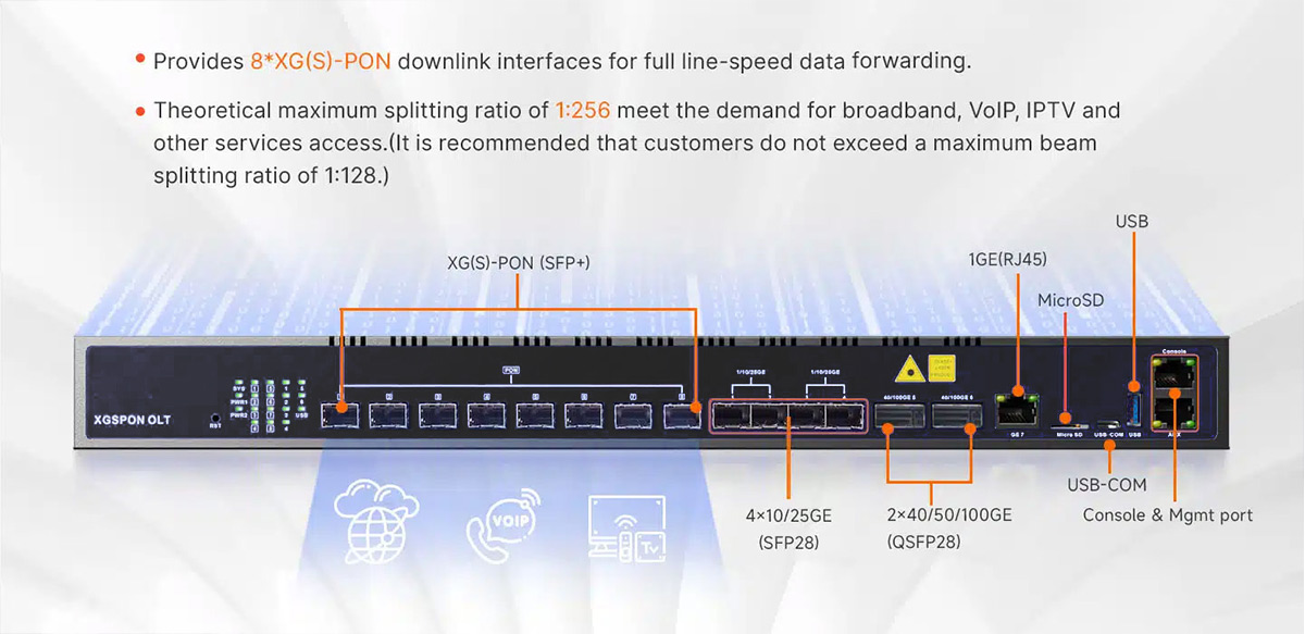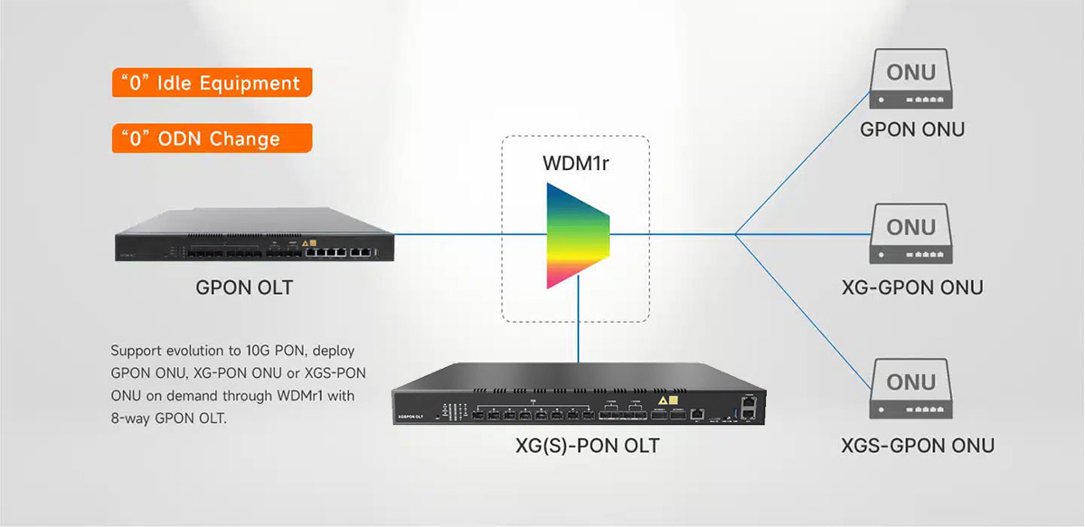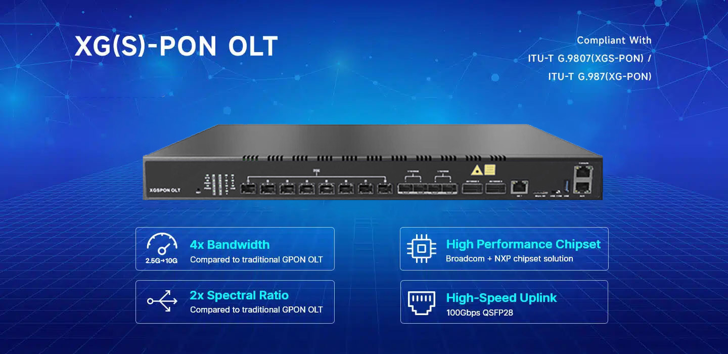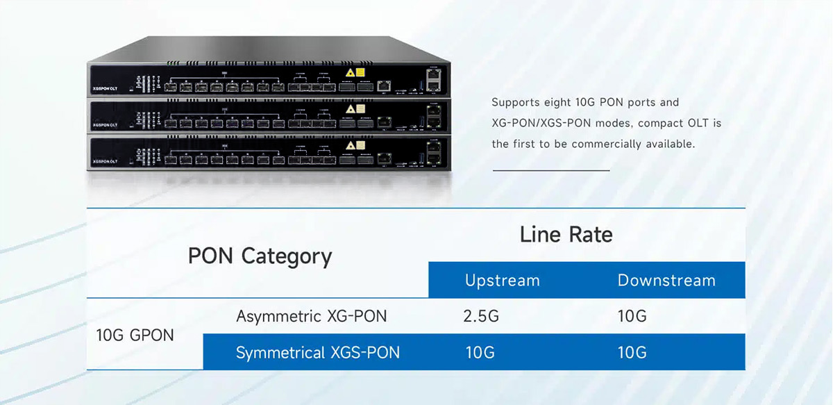 XG-PON: Upstream 2.5Gbps, Downstream: 10Gbps XGS-PON: Upstream 10Gbps, Downstream: 10Gbps |
